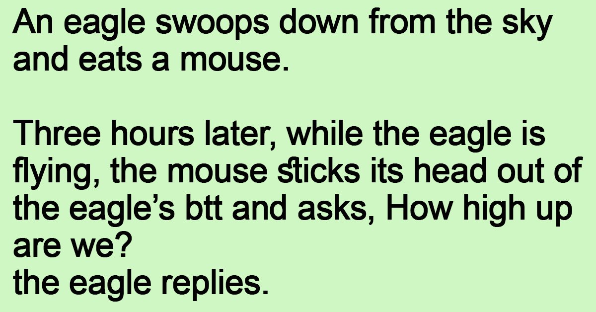 Three hours later, while the eagle is flying, the mouse sticks its head out of the eagle’s btt and asks, How high up are we?