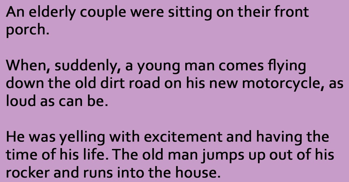 When, suddenly, a young man comes flying down the old dirt road on his new motorcycle, as loud as can be.