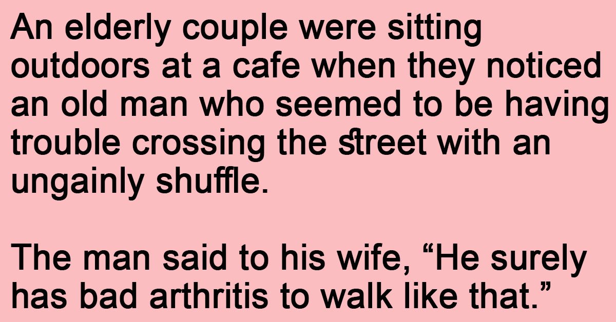 An elderly couple were sitting outdoors at a cafe when they noticed an old man who seemed to be having trouble crossing the street with an ungainly shuffle.