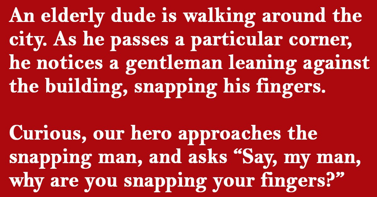 Curious, our hero approaches the snapping man, and asks “Say, my man, why are you snapping your fingers?”