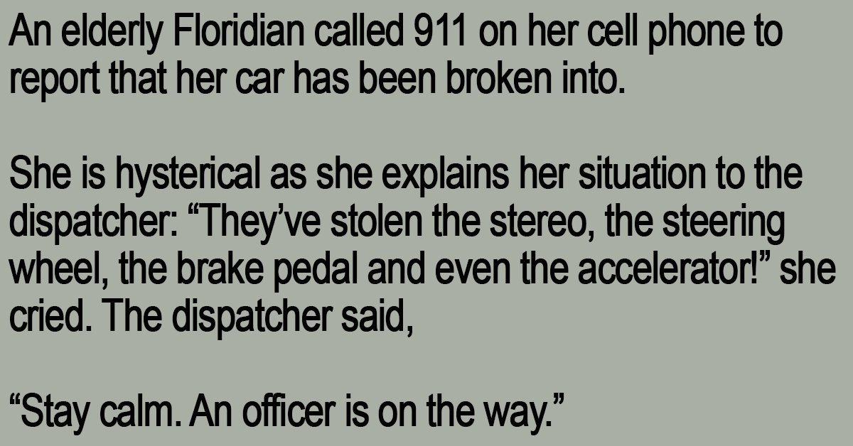 An elderly Floridian called 911 on her cell phone to report that her car has been broken into.