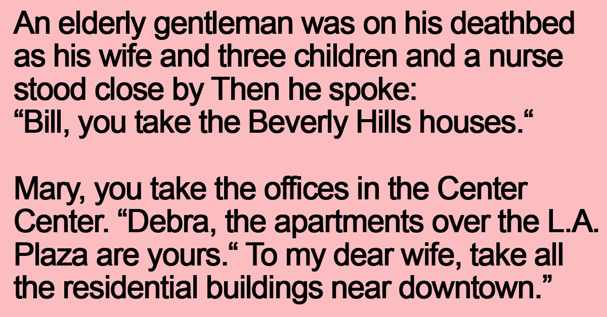 An elderly gentleman was on his deathbed as his wife and three children and a nurse stood close by Then he spoke: