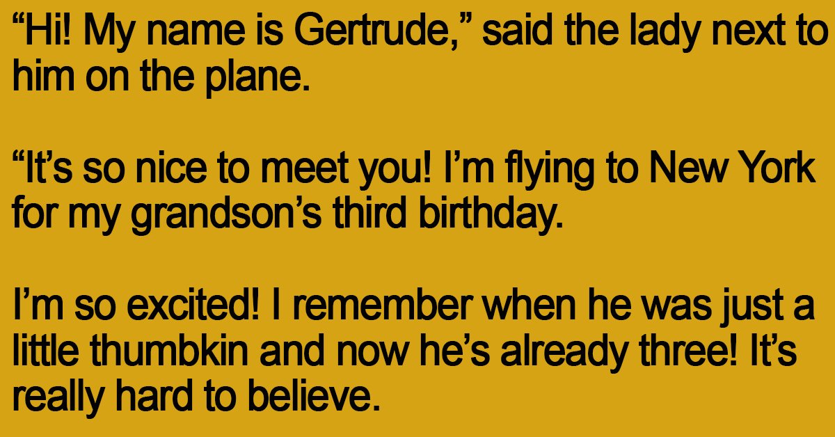 “Hi! My name is Gertrude,” said the lady next to him on the plane.