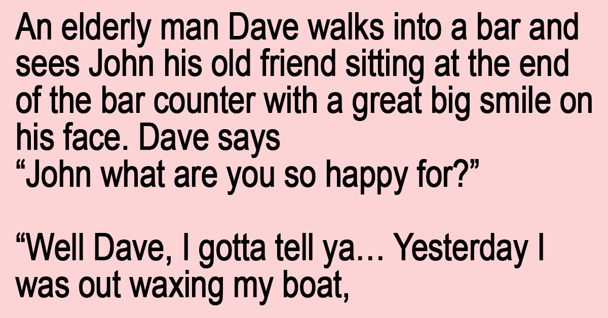 An elderly man Dave walks into a bar and sees John his old friend sitting at the end of the bar counter with a great big smile on his face.