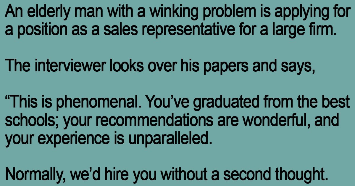 An elderly man with a winking problem is applying for a position as a sales representative for a large firm.