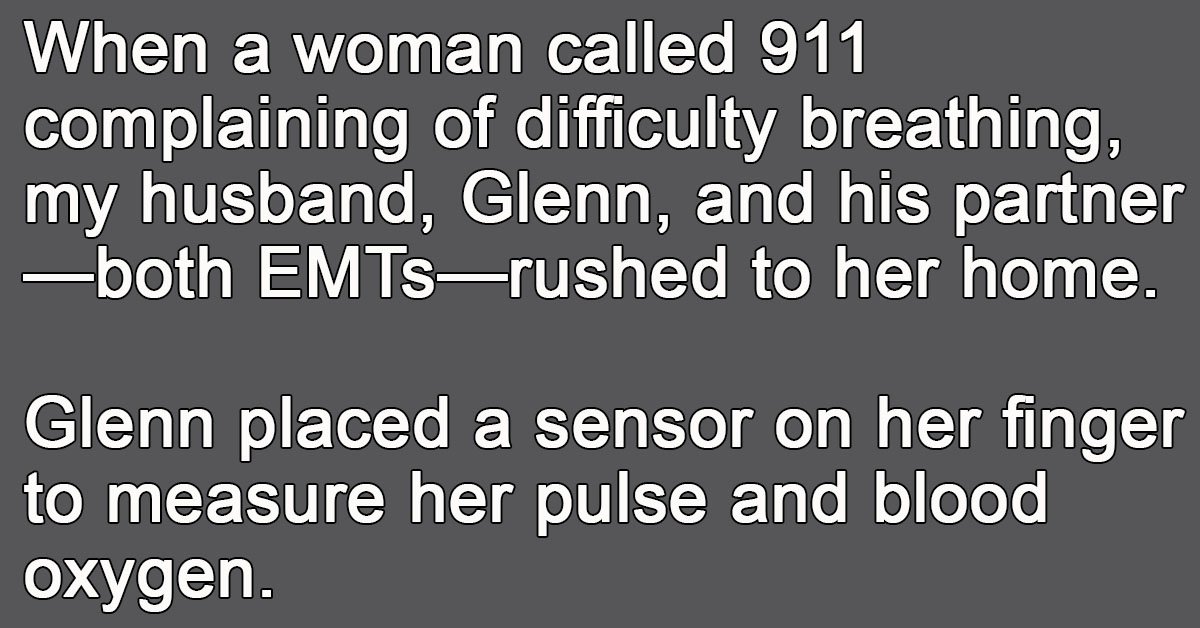 When a woman called 911 complaining of difficulty breathing, my husband, Glenn, and his partner—both EMTs—rushed to her home.