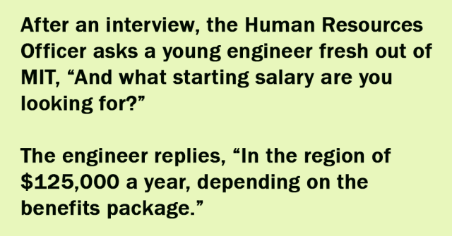 After an interview, the Human Resources Officer asks a young engineer fresh out of MIT, “And what starting salary are you looking for?”