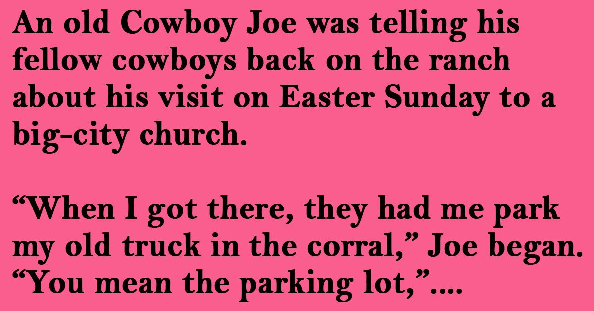 An old Cowboy Joe was telling his fellow cowboys back on the ranch about his visit on Easter Sunday to a big-city church.