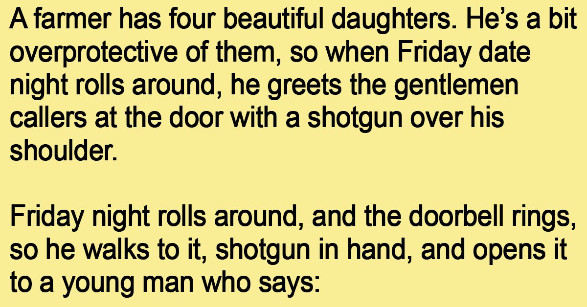 A few minutes later, the doorbell rings one last time, and the farmer opens the door with his shotgun over his shoulder to a young man who says: