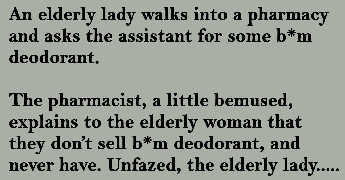 The pharmacist, a little bemused, explains to the elderly woman that they don’t sell b*m deodorant, and never have.