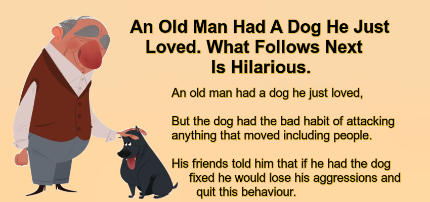 An Old Man Had A Dog He Just Loved. – May 12, 2022 by Kevin Adams Facebook Twitter Pinterest LinkedIn An old man had a dog he just loved, But the dog had the bad habit of attacking anything that moved including people. His friends told him that if he had the dog fixed he would lose his aggressions and quit this behaviour. So the old man had his dog fixed and a few days later was in his front room when the mailman came up the steps. The dog jumped up and went right thru the screen door and attacked the mailman. The old man ran out and pulled his dog off and began apologizing to the mailman. He said, “I am so sorry, I don’t know what to do or say. My friends told me he would quit attacking people if I had him fixed. I just don’t know what to do.” The mailman picked himself up and said, “You should have had his teeth pulled, I knew when he came out the door he wasn’t going to screw me.” Facebook Twitter Pinterest LinkedIn