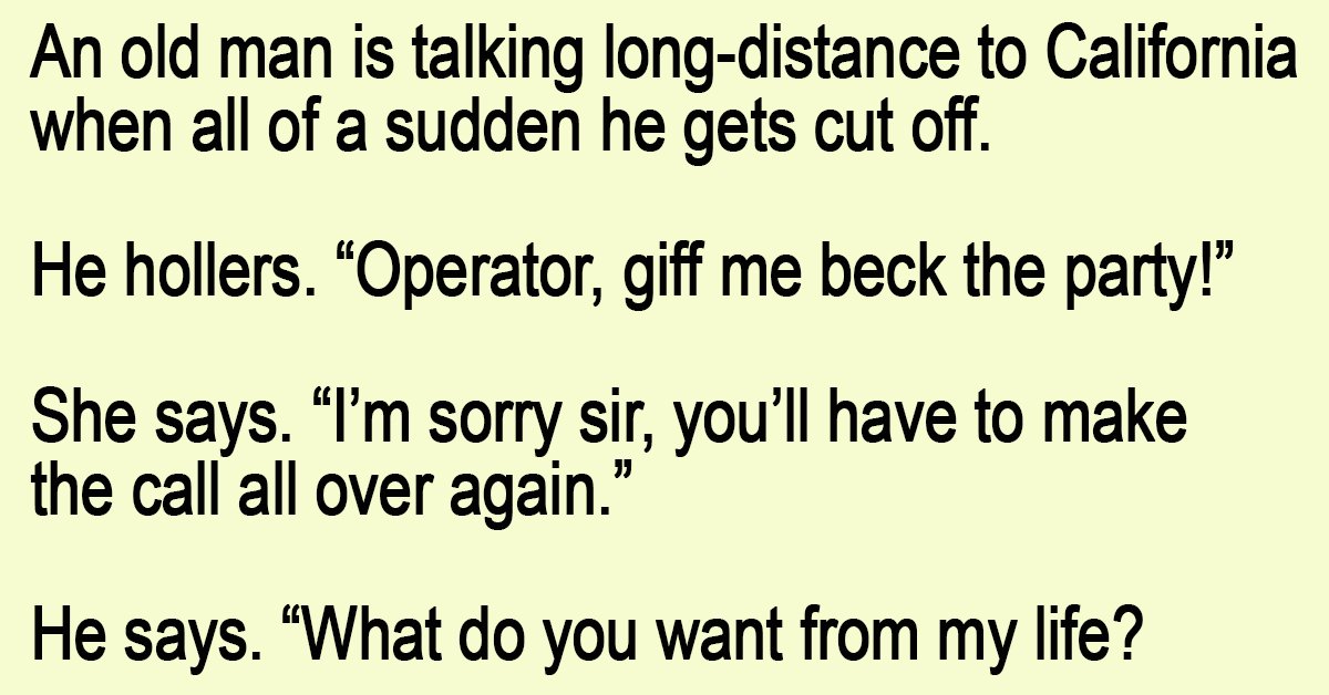 An old man is talking long-distance to California when all of a sudden he gets cut off.