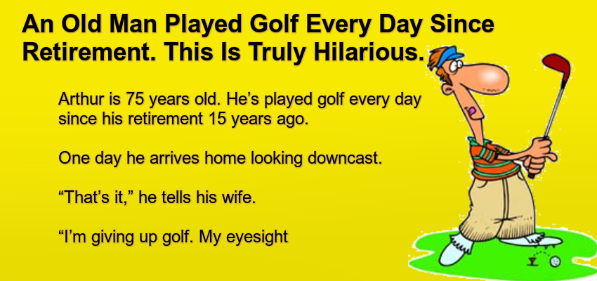 An Old Man Played Golf Every Day Since Retirement. – April 3, 2022 by Kevin Adams Facebook Twitter Pinterest LinkedIn Arthur is 75 years old. He’s played golf every day since his retirement 15 years ago. One day he arrives home looking downcast. “That’s it,” he tells his wife. “I’m giving up golf. My eyesight has become so bad that once I hit the ball I couldn’t see where it went.” His wife sympathises and makes him a cup of tea. As they sit down she says, “Why don’t you take my brother with you and give it one more try.” “That’s no good,” sighs Arthur, “your brother is 85. He can’t help.” “He may be 85,” says the wife, “but his eyesight is perfect.” So the next day Arthur heads off to the golf course with his brother-in-law. He tees up, takes a mighty swing and squints down the fairway. He turns to the brother-in-law and says, “Did you see the ball?” “Of course I did!” Answers the brother-in-law. “I have perfect eyesight.” “Where did it go?” Arthur asks. “I don’t remember.” Facebook Twitter Pinterest LinkedIn