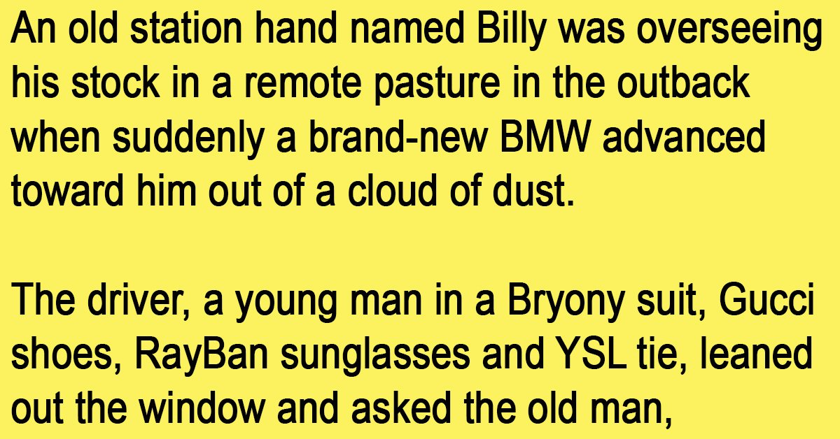 An old station hand named Billy was overseeing his stock in a remote pasture in the outback when suddenly a brand-new BMW advanced toward him out of a cloud of dust.