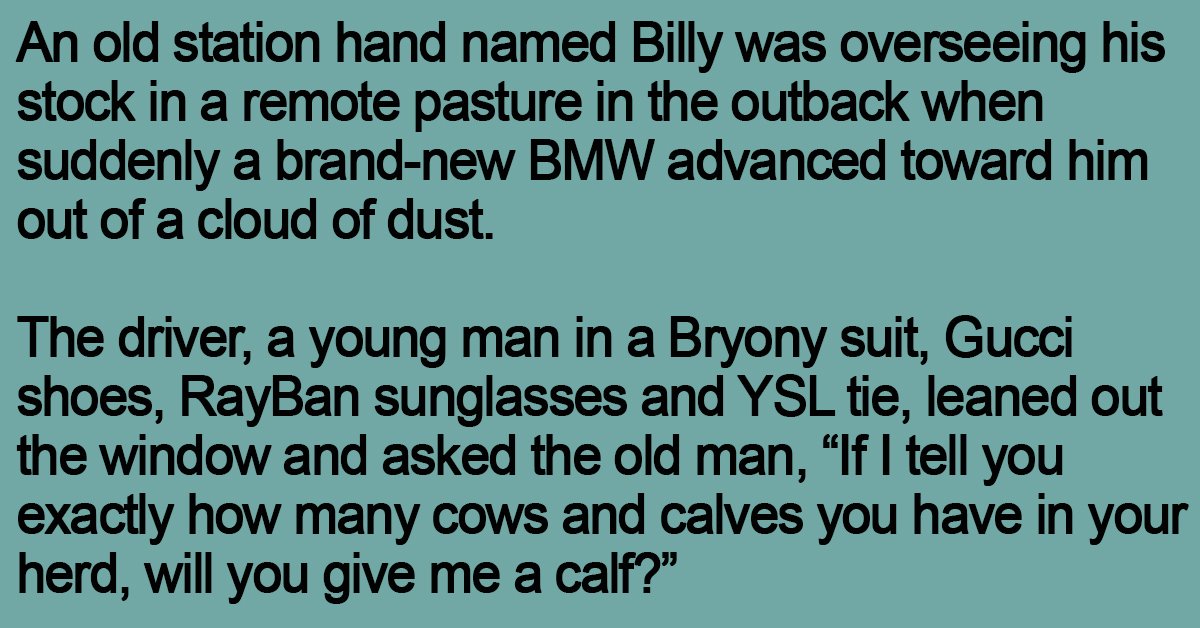 An old station hand named Billy was overseeing his stock in a remote pasture in the outback when suddenly a brand-new BMW advanced toward him out of a cloud of dust.