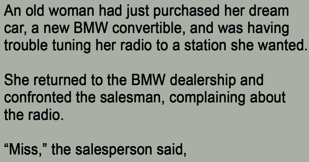An old woman had just purchased her dream car, a new BMW convertible, and was having trouble tuning her radio to a station she wanted.