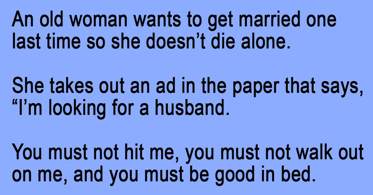 “I’m looking for a husband. You must not hit me, you must not walk out on me, and you must be good in bed. If you’re interested, come to my house tomorrow so I can get to know you.”