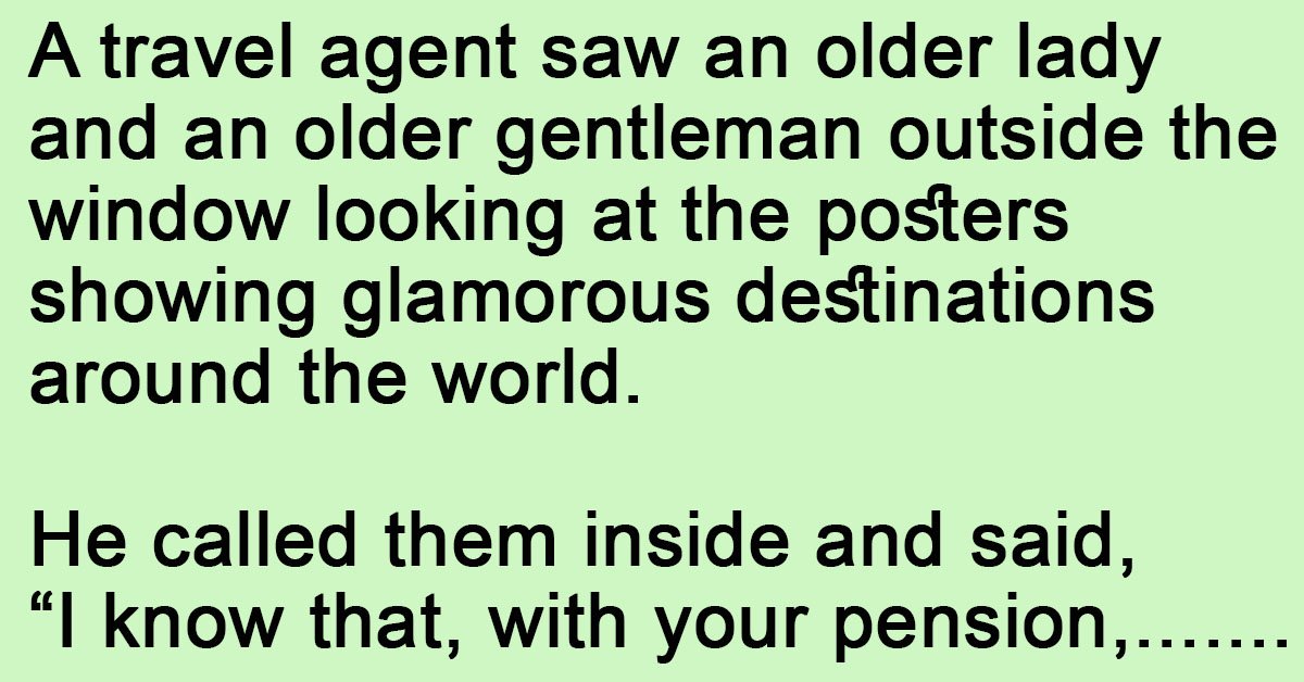 A travel agent saw an older lady and an older gentleman outside the window looking at the posters showing glamorous destinations around the world.