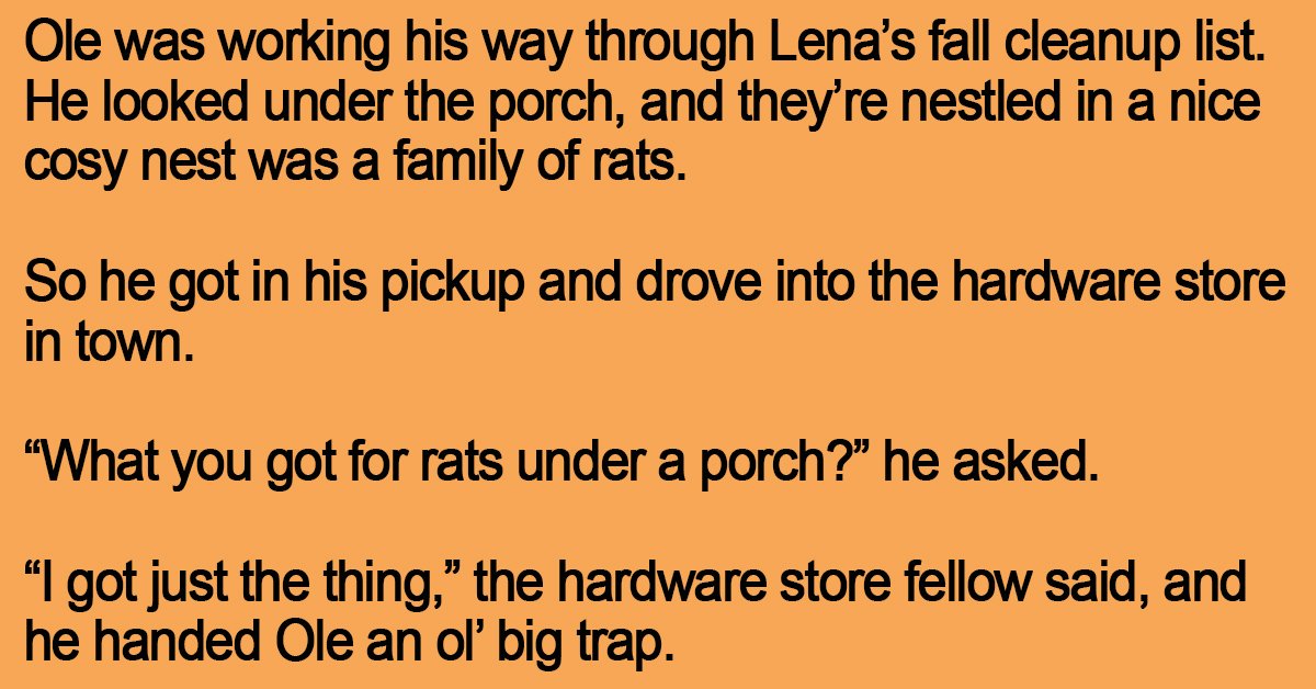 “I got just the thing,” the hardware store fellow said, and he handed Ole an ol’ big trap.