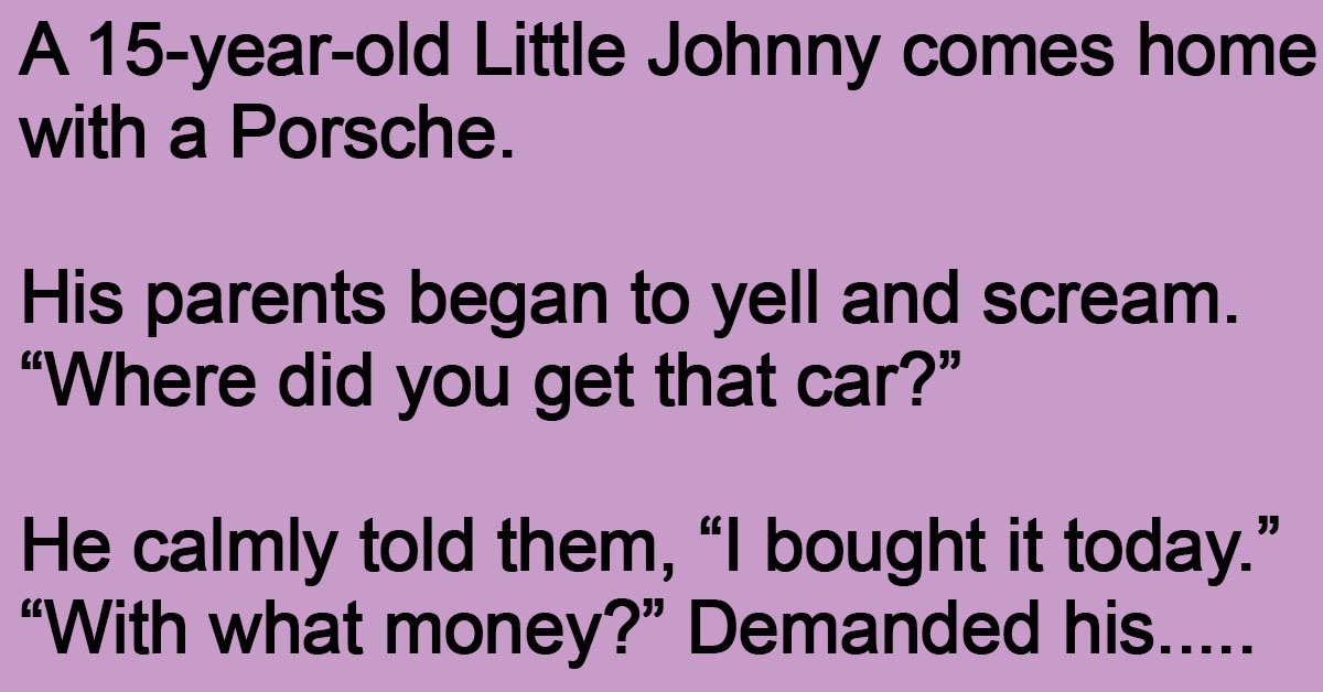 A 15-year-old Little Johnny comes home with a Porsche His parents began to yell and scream. “Where did you get that car?” He calmly told them, “I bought it today.” … …