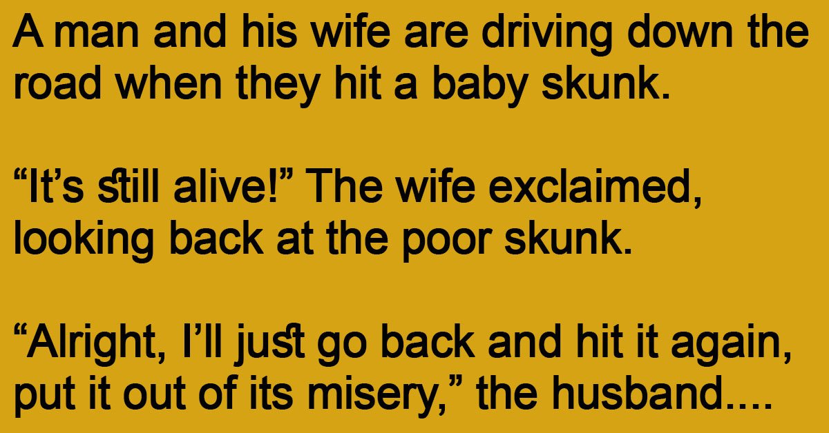 A man and his wife are driving down the road when they hit a baby skunk. “It’s still alive!” The wife exclaimed, looking back at the poor skunk. “Alright, I’ll … …