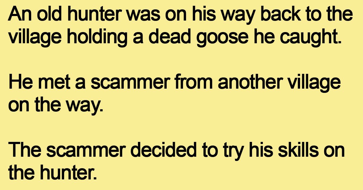An old hunter was on his way back to the village holding a dead goose he caught. He met a scammer from another village on the way. The scammer decided … …