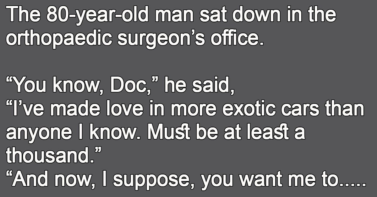The 80-year-old man sat down in the orthopaedic surgeon’s office. “You know, Doc,” he said, “I’ve made love in more exotic cars than anyone I know. Must be at least … …