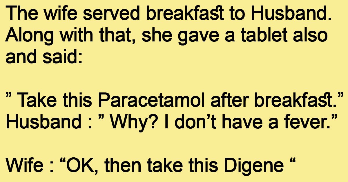 The wife served breakfast to Husband. Along with that, she gave a tablet also and said: ” Take this Paracetamol after breakfast.” Husband : ” Why? I don’t have a … …