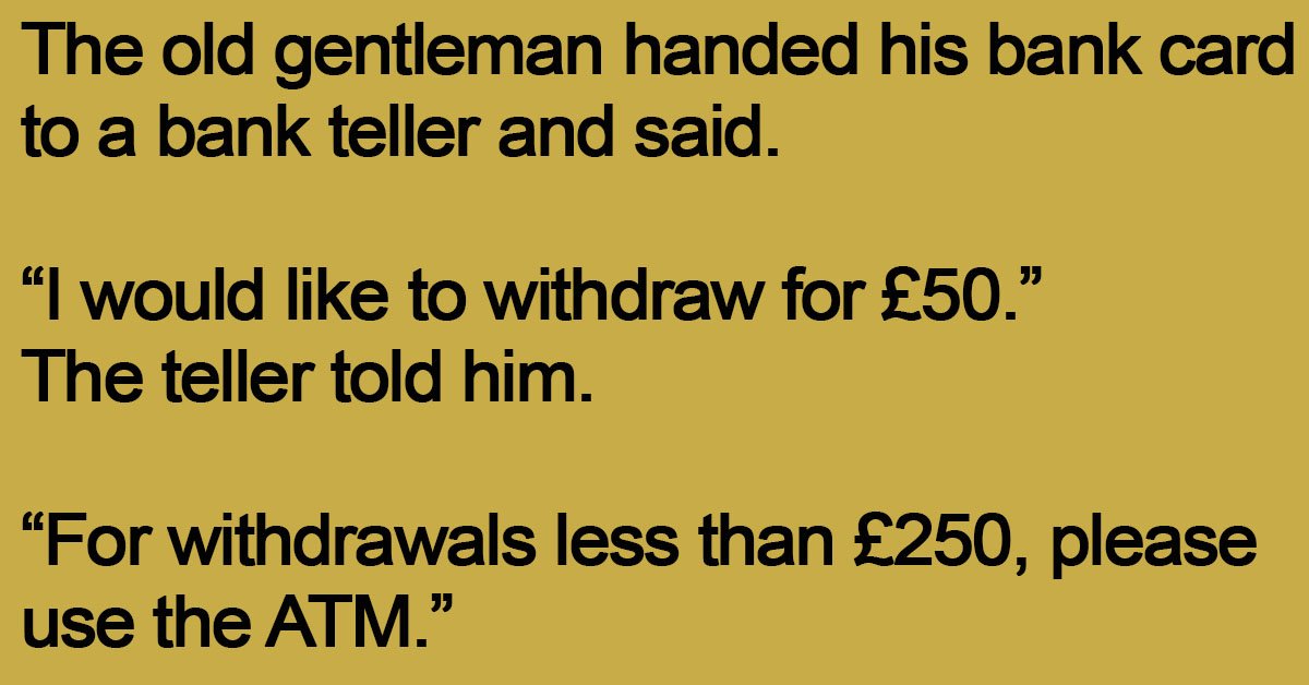 The old gentleman handed his bank card to a bank teller and said. “I would like to withdraw for £50.” The teller told him. “For withdrawals less than £250, please … …