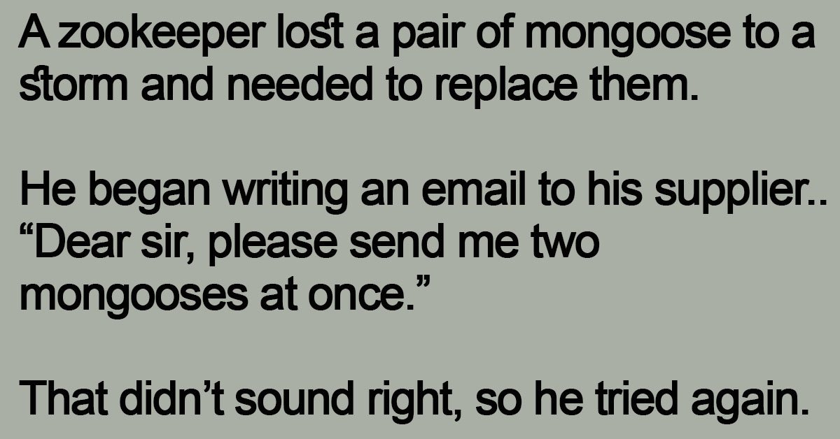 A zookeeper lost a pair of mongoose to a storm and needed to replace them. He began writing an email to his supplier… “Dear sir, please send me two mongooses … …