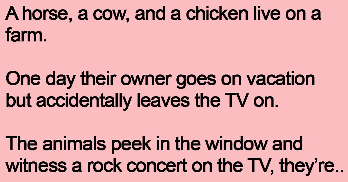 A horse, a cow, and a chicken live on a farm. One day their owner goes on vacation but accidentally leaves the TV on. The animals peek in the window … …