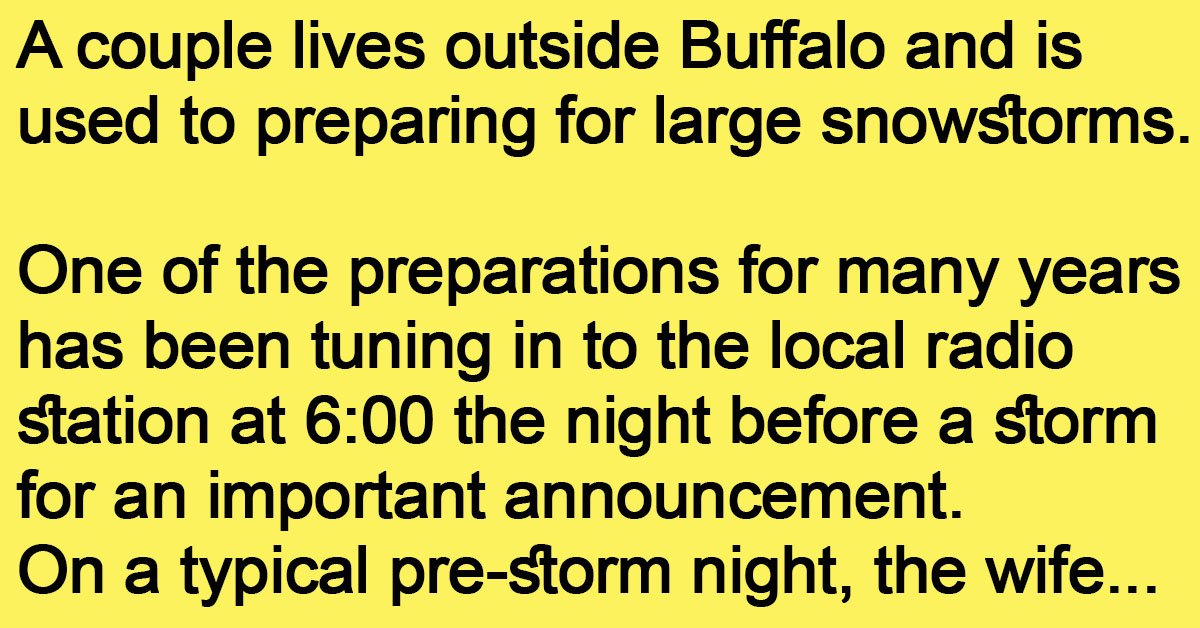 A couple lives outside Buffalo and is used to preparing for large snowstorms. One of the preparations for many years has been tuning in to the local radio station at … …