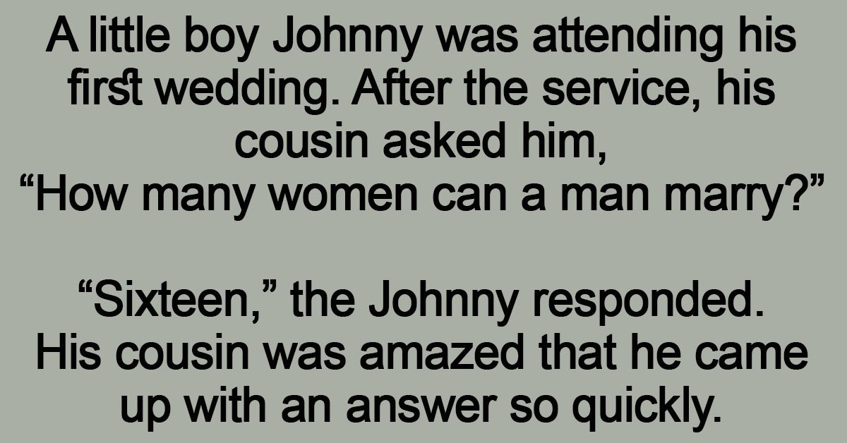 A little boy Johnny was attending his first wedding. After the service, his cousin asked him, “How many women can a man marry?” “Sixteen,” the Johnny responded. His cousin was … …