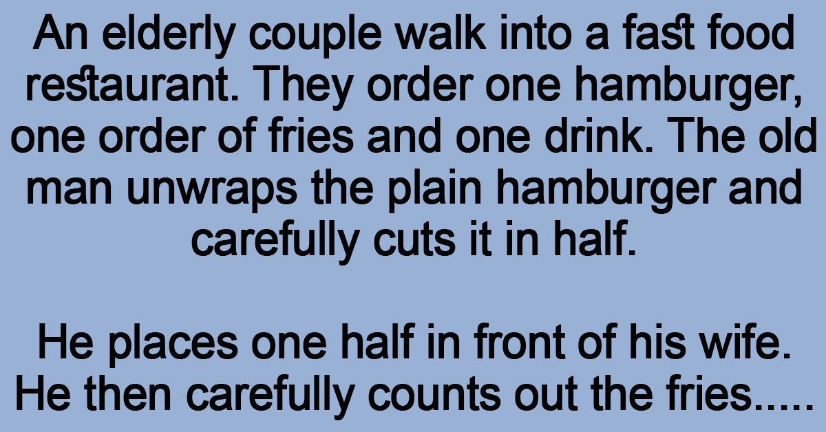 An elderly couple walk into a fast food restaurant. They order one hamburger, one order of fries and one drink. The old man unwraps the plain hamburger and carefully cuts … …