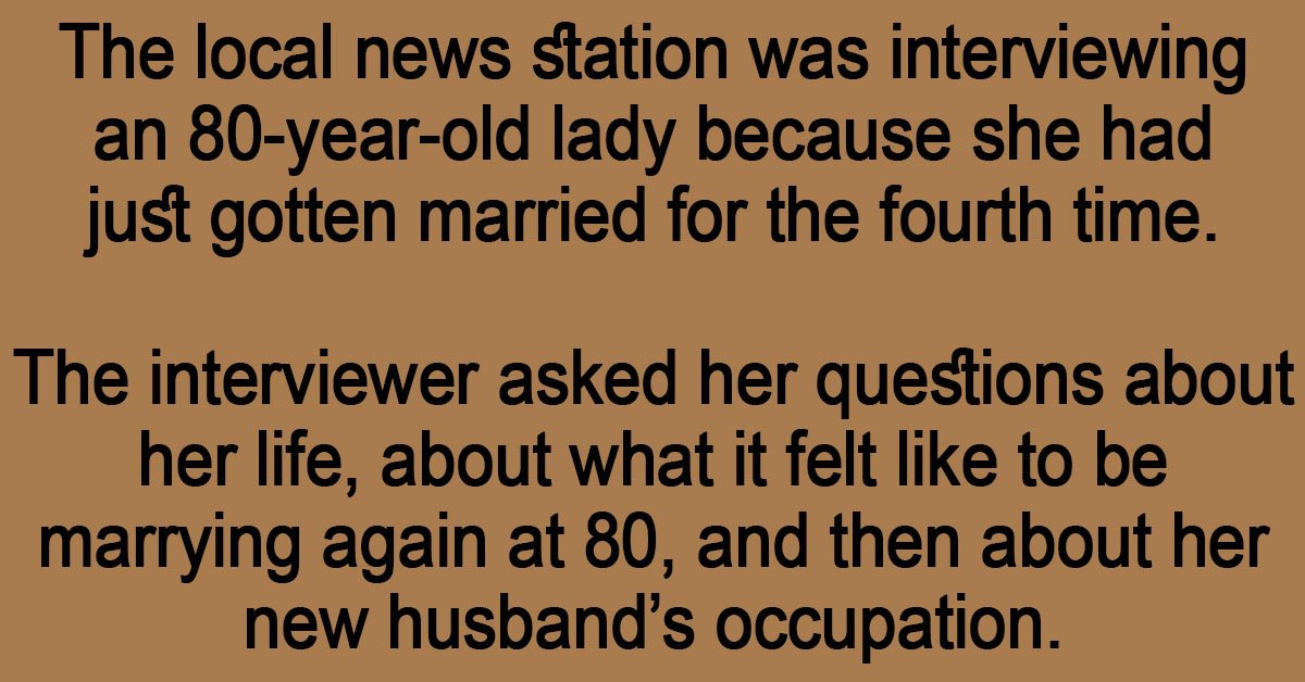 The local news station was interviewing an 80-year-old lady because she had just gotten married for the fourth time. The interviewer asked her questions about her life, about what it … …