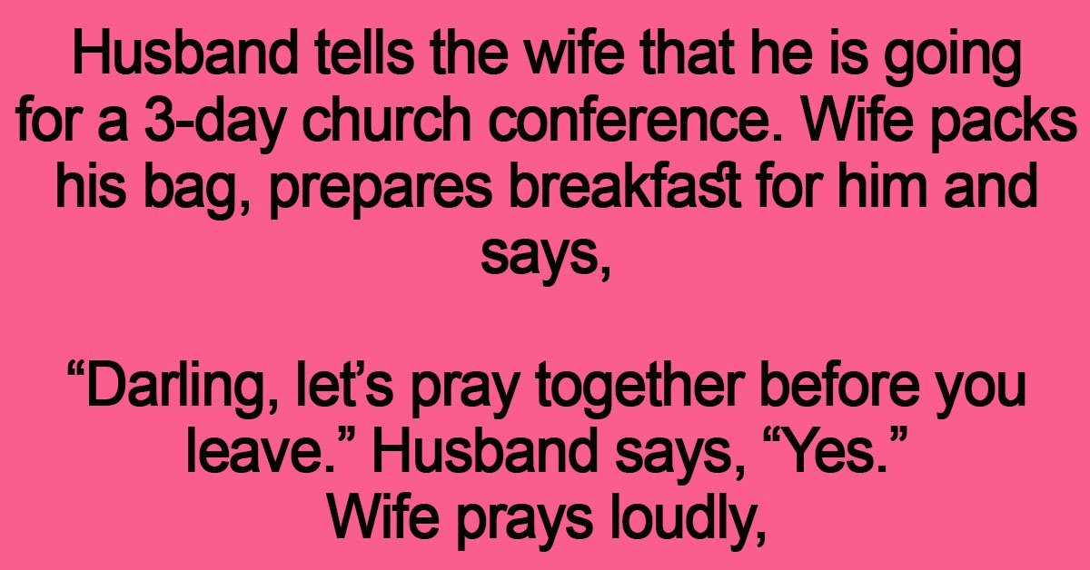 Husband tells the wife that he is going for a 3-day church conference. Wife packs his bag, prepares breakfast for him and says, “Darling, let’s pray together before you leave.” … …
