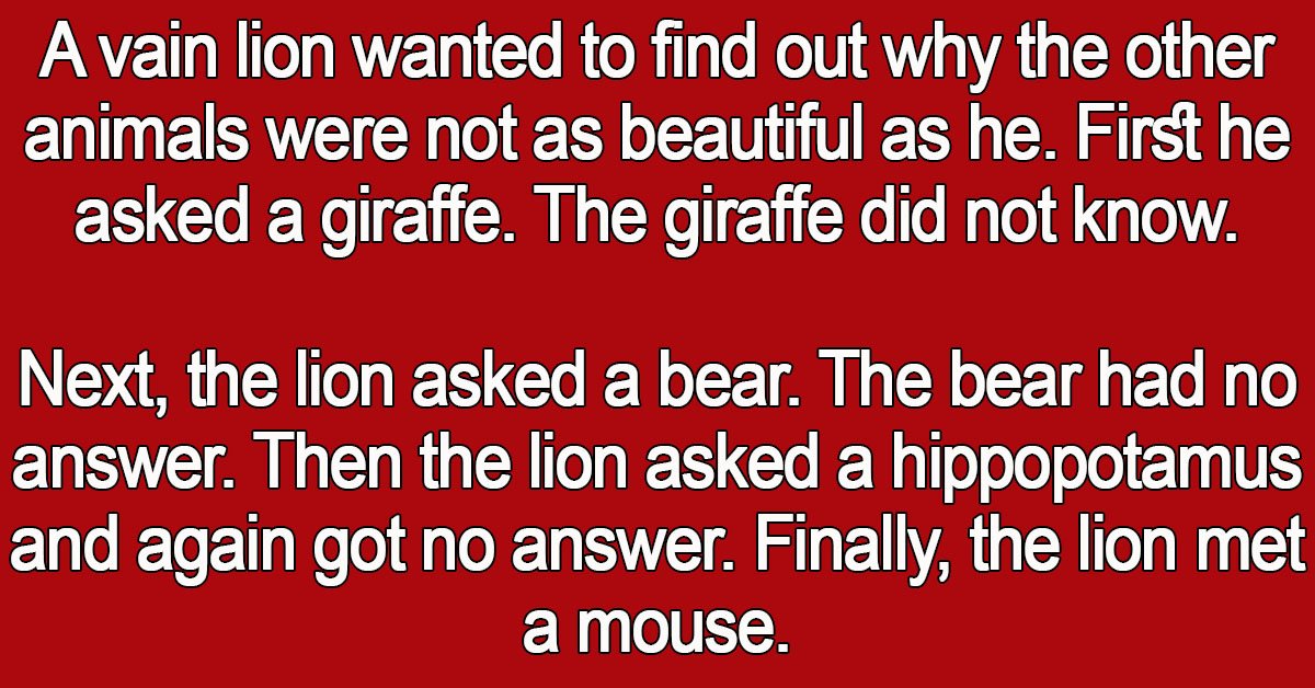 A vain lion wanted to find out why the other animals were not as beautiful as he. First he asked a giraffe. The giraffe did not know. Next, the lion … …