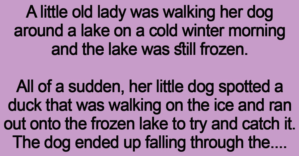 A little old lady was walking her dog around a lake on a cold winter morning and the lake was still frozen. All of a sudden, her little dog spotted … …