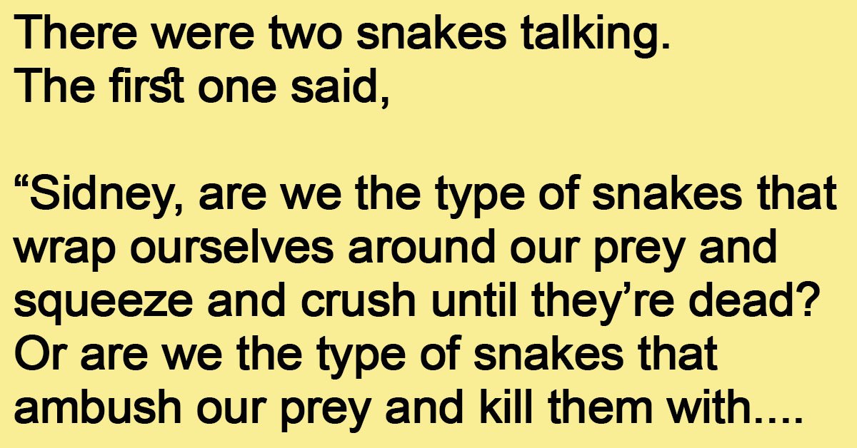 There were two snakes talking. The first one said “Sidney, are we the type of snakes that wrap ourselves around our prey and squeeze and crush until they’re dead? Or are … …