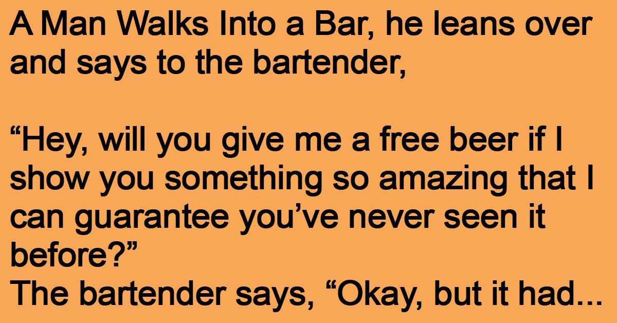 A Man Walks Into a Bar, he leans over and says to the bartender, “Hey, will you give me a free beer if I show you something so amazing that … …