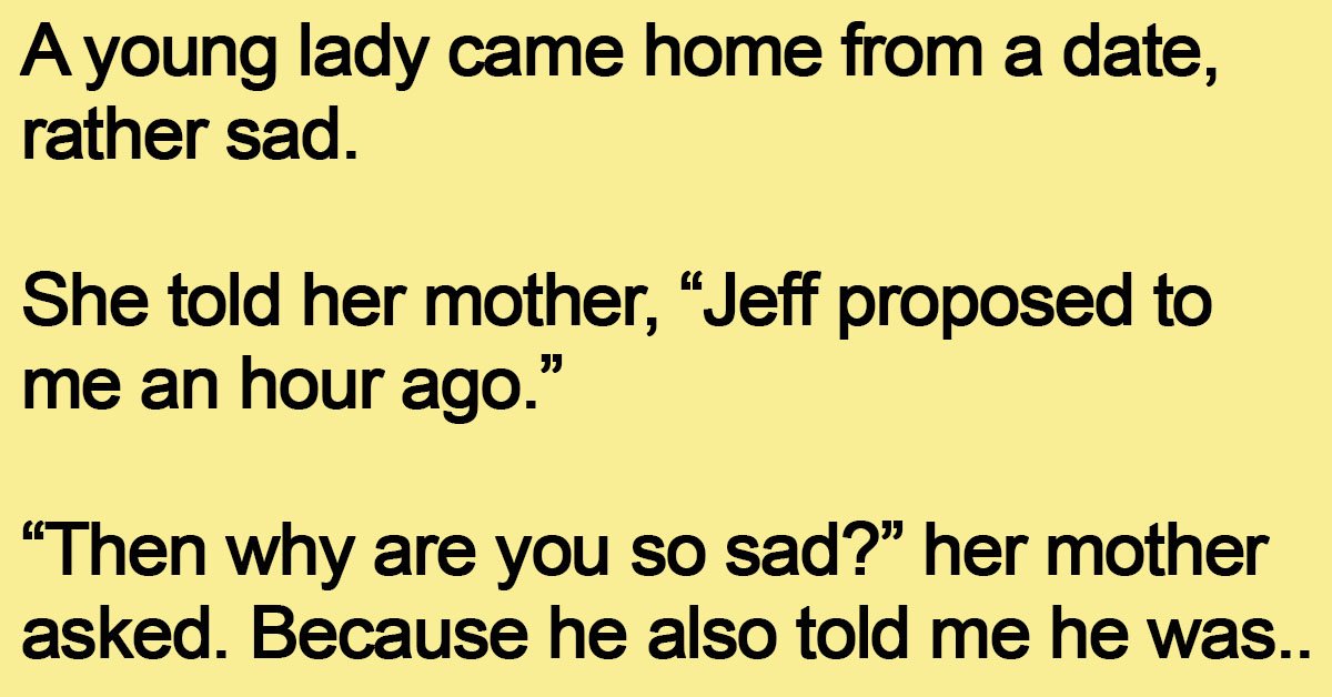 A young lady came home from a date, rather sad. She told her mother, “Jeff proposed to me an hour ago.” “Then why are you so sad?” her mother asked. … …
