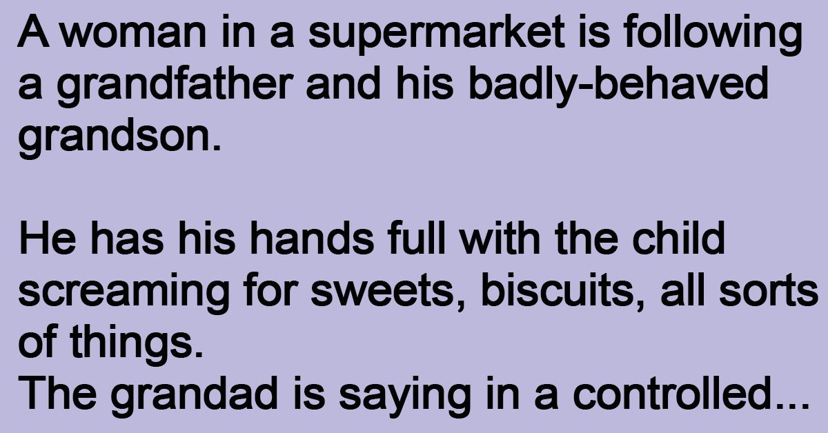 A woman in a supermarket is following a grandfather and his badly-behaved grandson. He has his hands full with the child screaming for sweets, biscuits, all sorts of things. The … …
