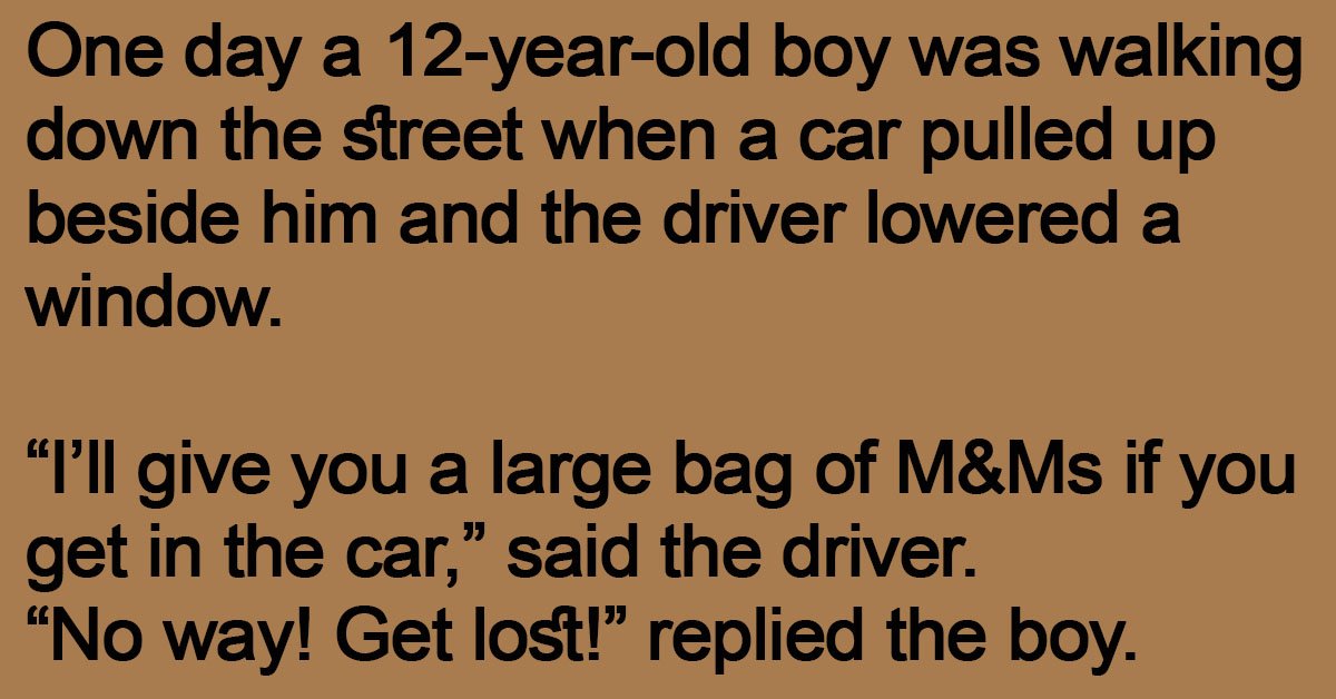 One day a 12-year-old boy was walking down the street when a car pulled up beside him and the driver lowered a window. “I’ll give you a large bag of … …
