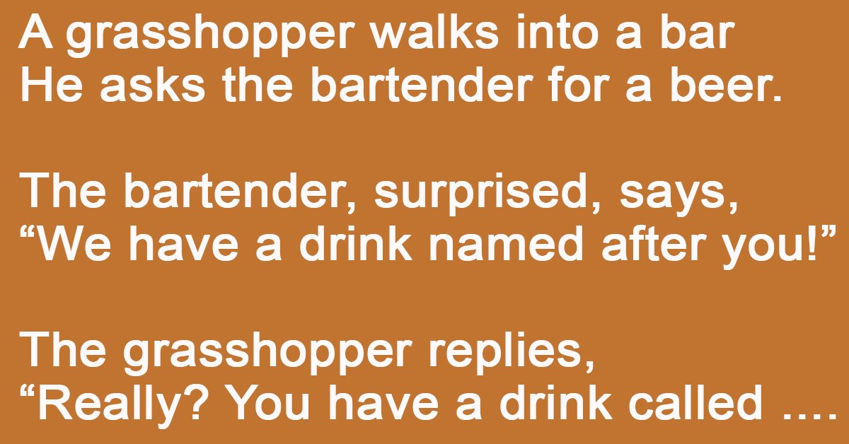 A grasshopper walks into a bar He asks the bartender for a beer. The bartender, surprised, says, “We have a drink named after you!” The grasshopper replies, “Really? You … …