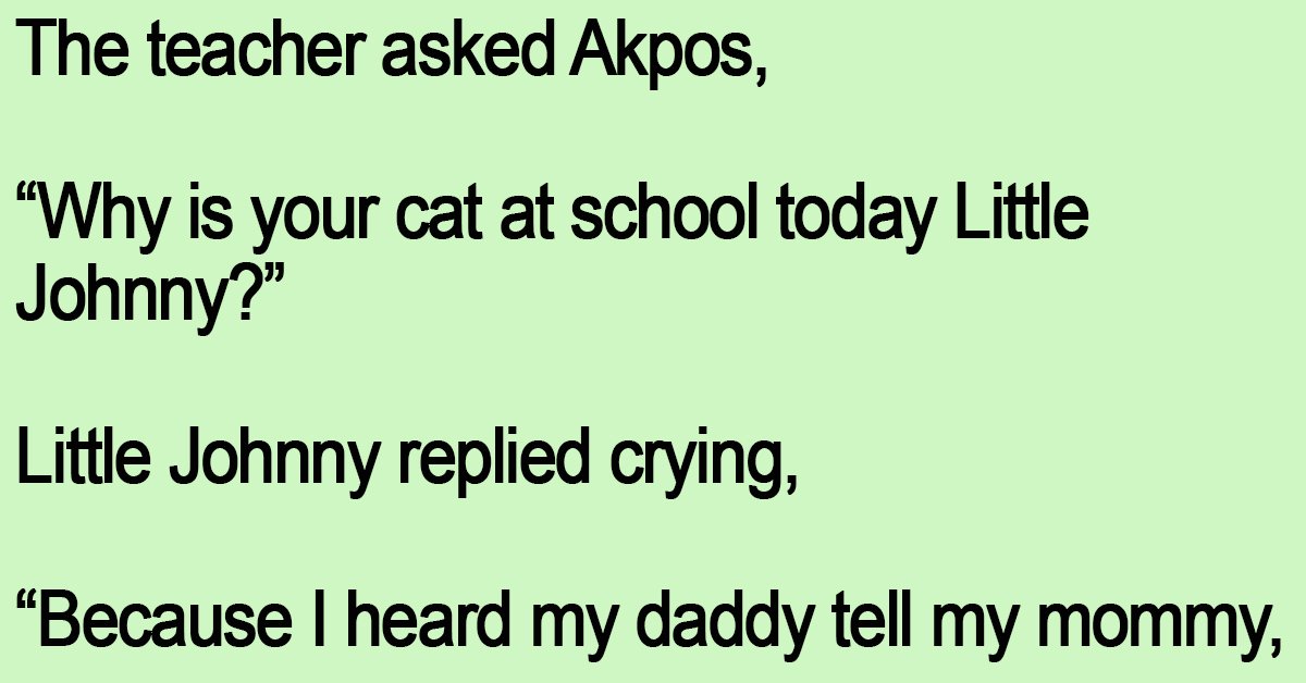The Teacher Asked Little Johnny. September 18, 2022 by Kevin Adams Facebook Twitter Pinterest LinkedInThe teacher asked Akpos, “Why is your cat at school today Little Johnny?” Little Johnny replied crying, “Because I heard my daddy tell my mommy, ‘I am going to eat that p*$$y once Little Johnny leaves for school today!’” Facebook Twitter Pinterest LinkedIn