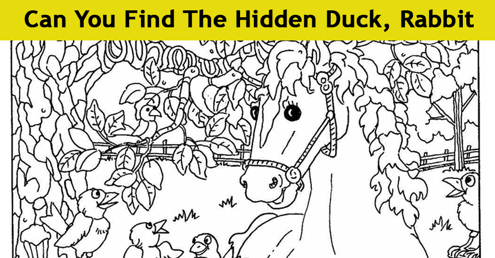 Here below we can see an ordinary photograph of a tree with a horse and birds, but somewhere in the picture, there’s a duck, rabbit hiding.