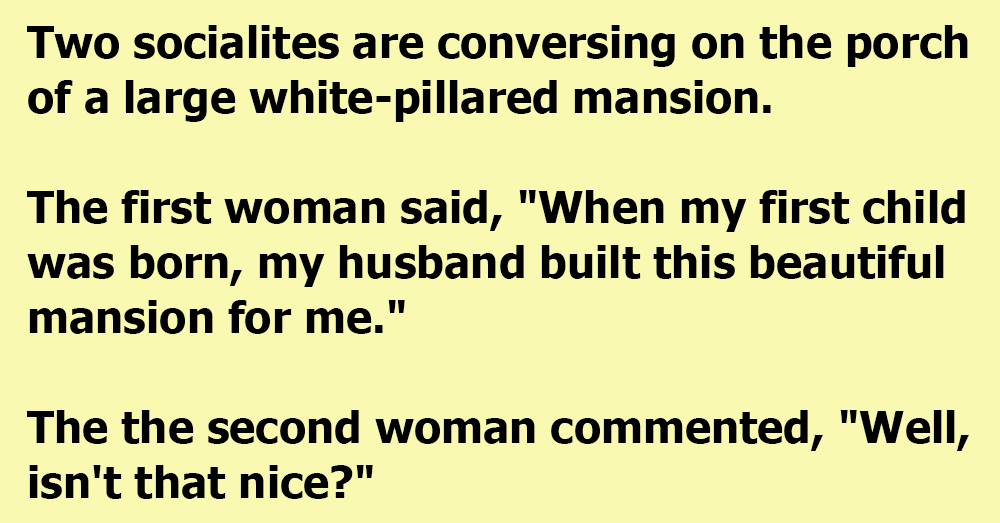 The first woman said, “When my first child was born, my husband built this beautiful mansion for me.”