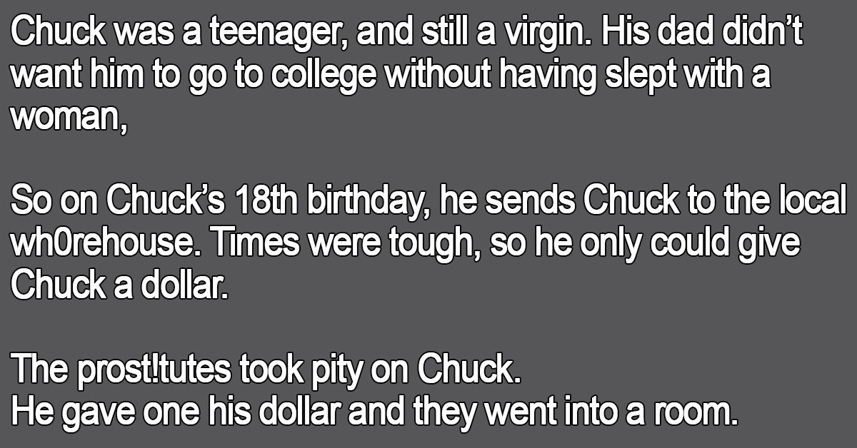 So on Chuck’s 18th birthday, he sends Chuck to the local wh0rehouse.