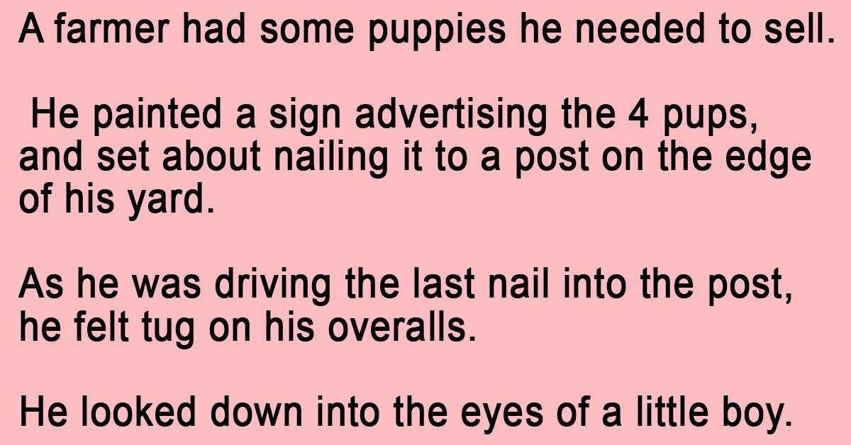 The farmer knelt down at the boy’s side and said, “Son, you don’t want that puppy. He will never be able to run and play with you like these other dogs would.”