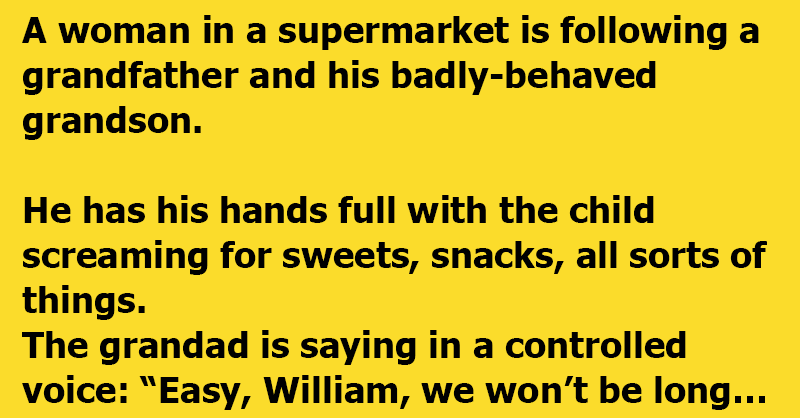 At the checkout the little horror is throwing items out of the cart. Grandad says again in a controlled voice :“William, William, relax buddy, don’t get upset. We’ll be home in five minutes, stay cool William.”